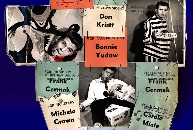 Being the high school photographer gave me some much needed status and self-confidence. I was invited to join Phi Alpha Sigma fraternity and when our brother Frank Cermak ran for General Organization president at Bayside High School, I suddenly found myself in the thick of high school politics. These are some of the campaign tags I wore as a necklace. The pix of Frank were by yours truly.