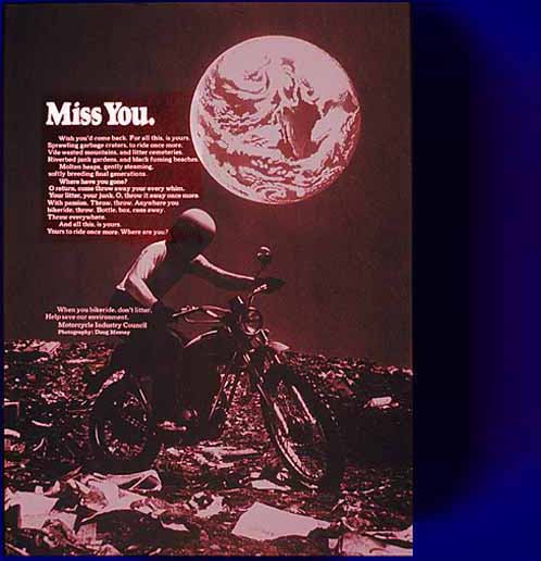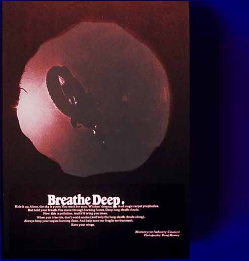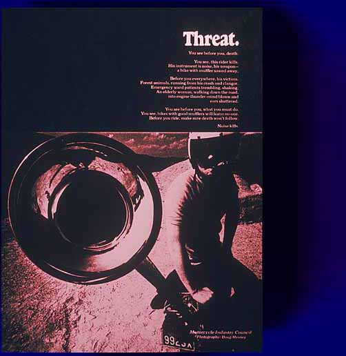 Cycle Magazine sold Motorcycle Industry Council a public-service ad campaign. The magazine assigned Tom Rydinger to be Art Director and Art Guerero to be writer. I was selected as the photographer. The three of us collaborated to produce this campaign which was honored with an award by Communications Arts Magazine (CA). In total there are six ads.