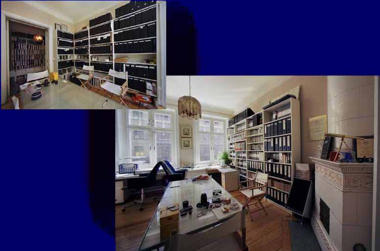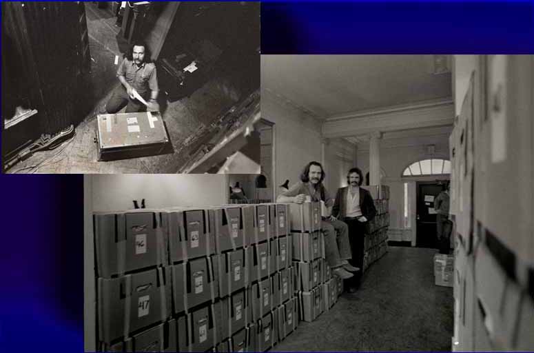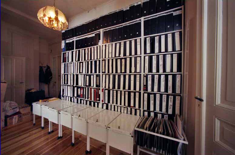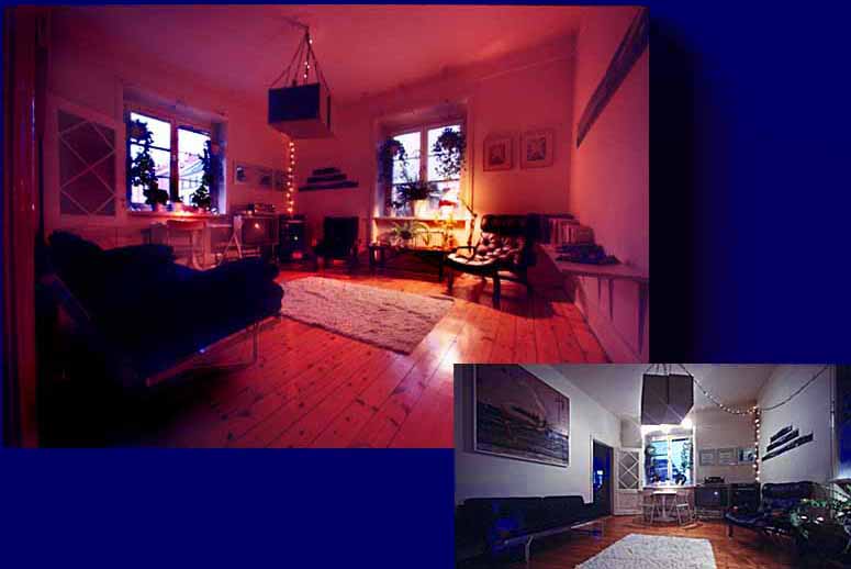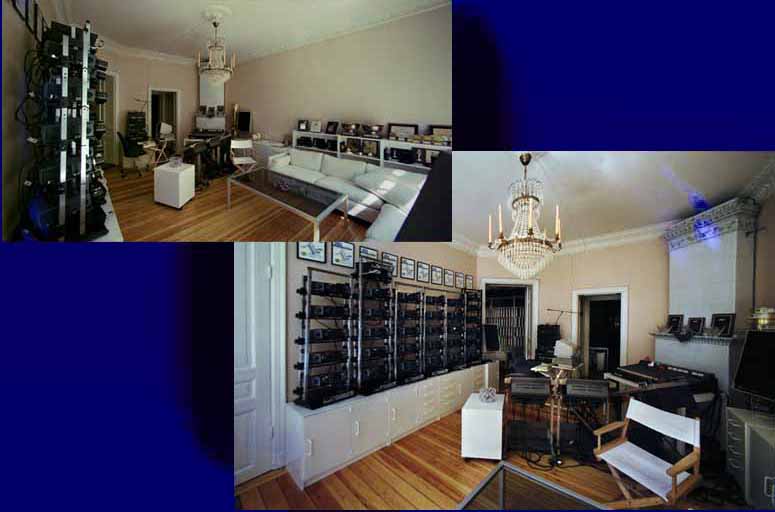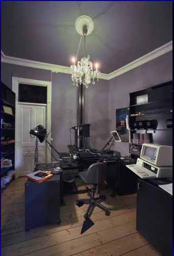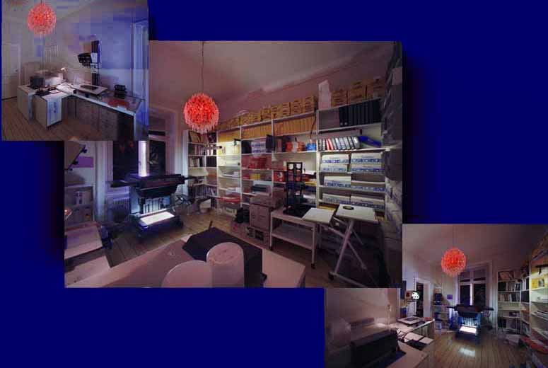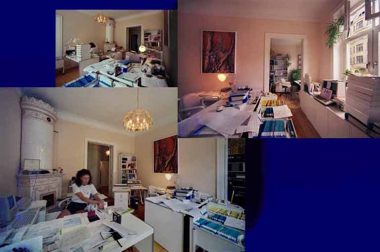 On the left, the original set-up at Hornsgatan 100 in Stockholm, and on the right, the same room 6 months and 15 projectors later. Eventually, 30 projectors would crowd into the same space. There would have been more if there were enough electricity. The image library, then some 500,000 slides, can be seen in the background.