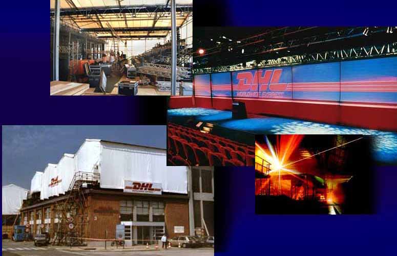 Mediatech built a theater on top of DHL's existing hangar office wing. It housed a VIP lounge and theater for 200 people to see a 30-projector show with six screens that slid apart to reveal a panoramic vista view of the giant hub operation in the hangar beyond, lit with lasers and stage lights. Workers in ultraviolet-light-sensitive costumes glowed, as did the packages on the conveyors. Audiences cycled every two hours. All this was the brainchild of Arthur Havers, then Marketing Director for DHL in Europe.